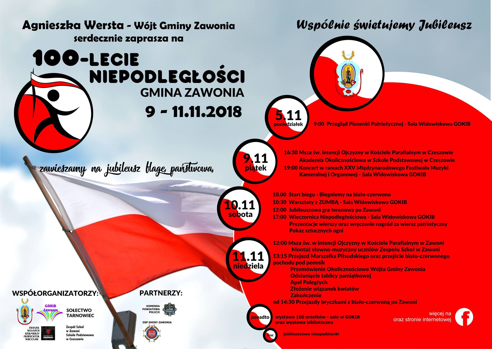 Agnieszka Wersta Wójt Gminy Zawonia wraz z organizatorami zapraszają mieszkańców na uroczyste obchody 100-lecia odzyskania przez Polskę niepodległości.