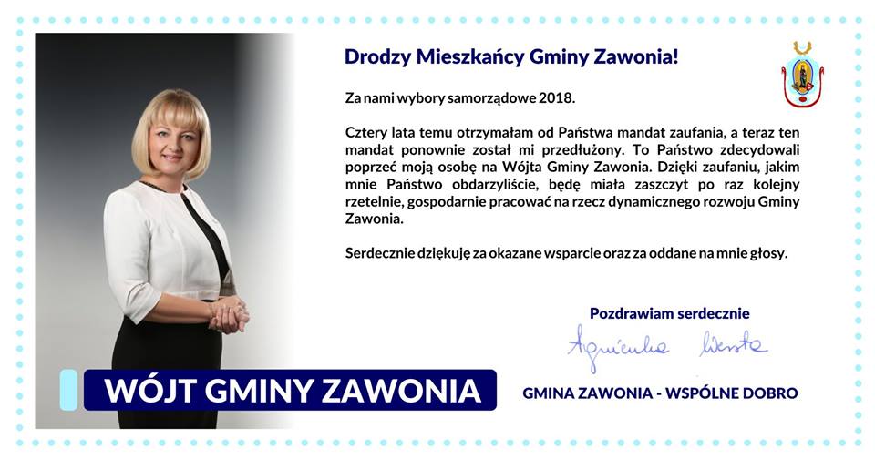 Gratuluję także wszystkim kandydatom, którzy otrzymali mandat radnego. To w naszych rękach leży teraz przyszłość Gminy Zawonia i praca na rzecz jej gospodarnego ROZWOJU.