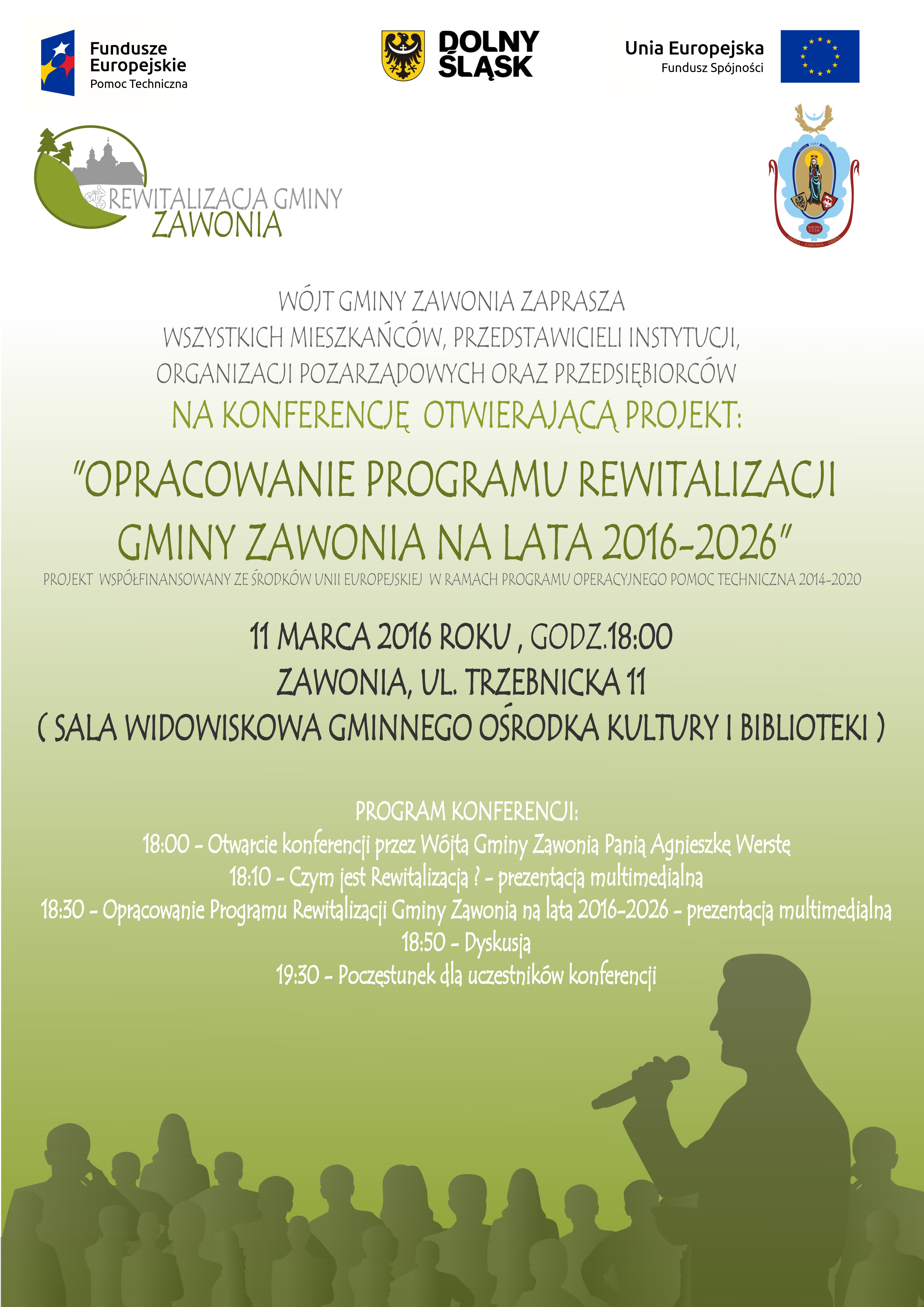 W piątek 11 marca 2016 r. o godz. 18:00 zapraszamy na pierwsze spotkanie informacyjne w ramach konferencji otwierającej projekt (sala widowiskowa Gminnego Ośrodka Kultury i Biblioteki w Zawoni przy ulicy Trzebnickiej 11). Na konferencji zostaną zaprezentowane zagadnienia, jakie będą przedmiotem  Programu oraz harmonogram prac na najbliższe miesiące.