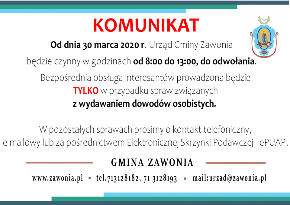 Zmiana godzin pracy Urzędu Gminy Zawonia - aktualizacja