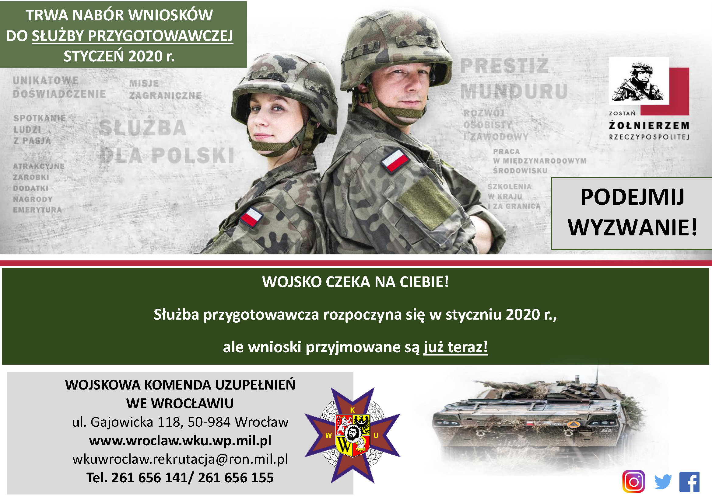 Nie odkładaj swoich marzeń na później i już dzisiaj złóż wniosek w Wojskowej Komendzie Uzupełnień we Wrocławiu, która prowadzi rekrutację na I turnus służby przygotowawczej w 2020 r., pełnionej na potrzeby korpusu szeregowych.
