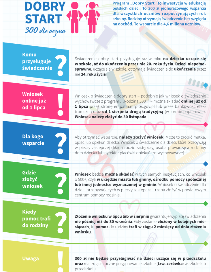 Dla kogo wsparcie? Świadczenie „Dobry start”, w wysokości 300 zł., przysługuje raz w roku na każde dziecko rozpoczynające rok szkolny do 20 roku życia. W przypadku dzieci lub osób uczących się i legitymujących się orzeczeniem o niepełnosprawności świadczenie to przysługuje do 24 roku życia.