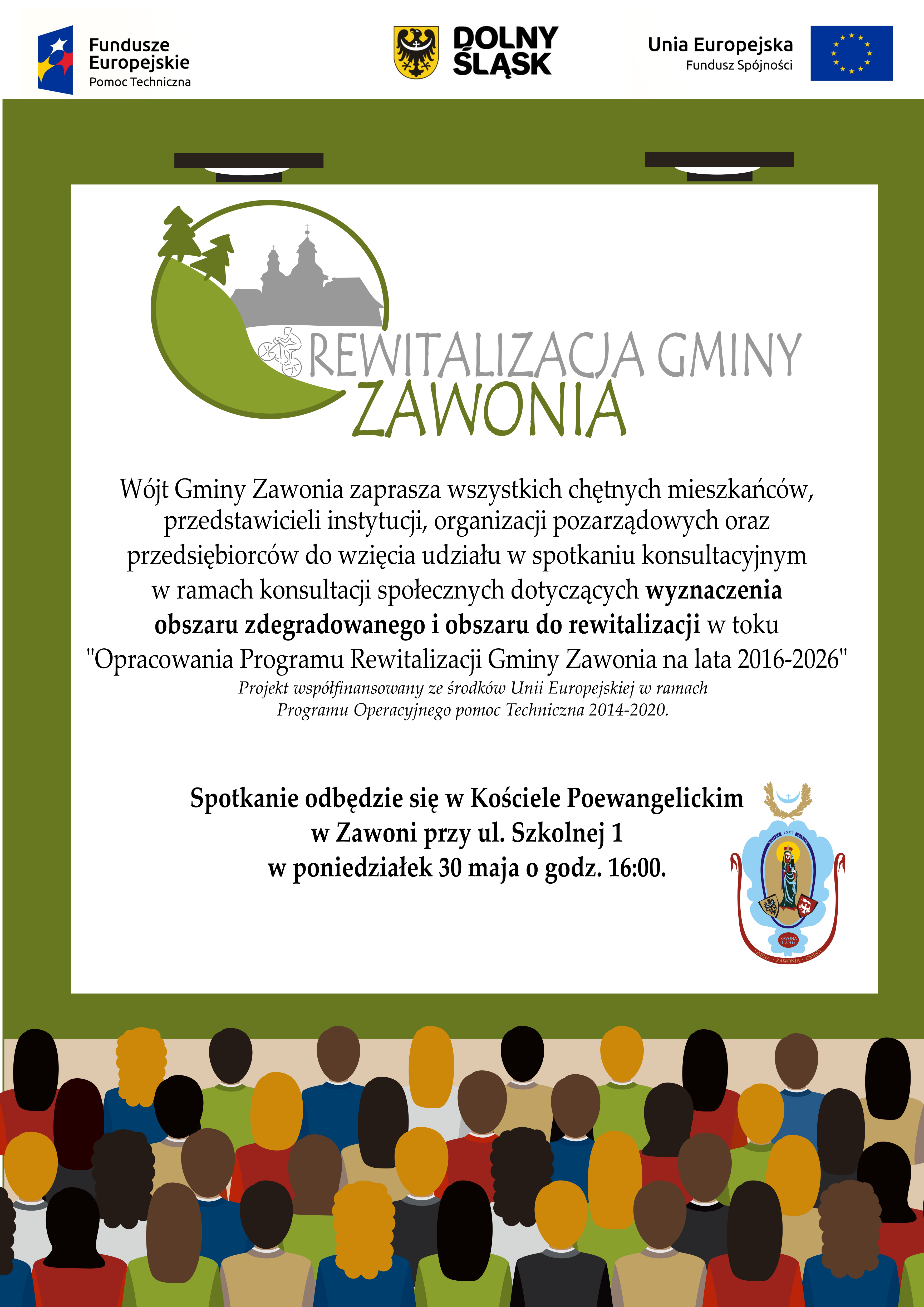 Konsultacje przeprowadzone zostaną w formie otwartego spotkania, które odbędzie się w dniu 30 maja o godz. 1600 w kościele poewangelickim przy ul. Szkolnej 1 w Zawoni.