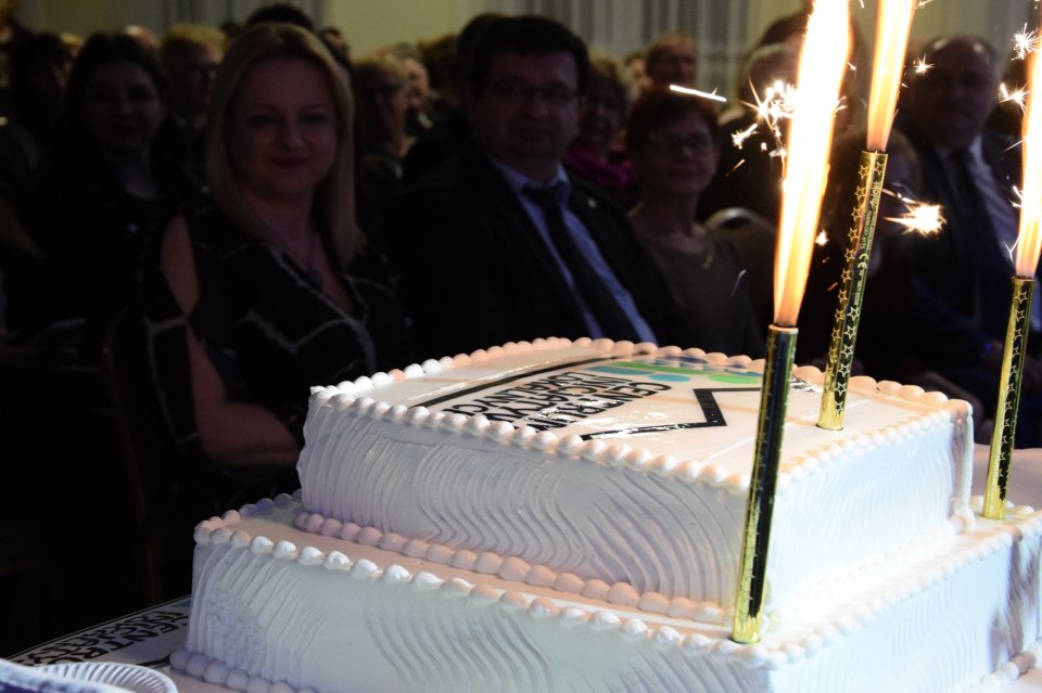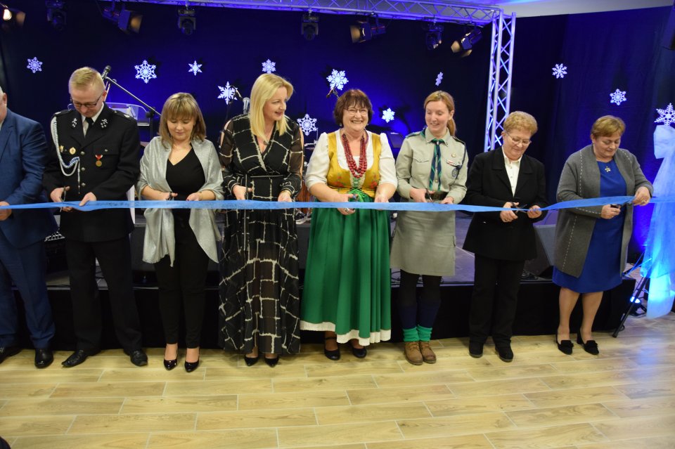 Pani Wójt zaprosiła wszystkich wyróżnionych, by razem z nią dokonali symbolicznego przecięcia wstęgi. Po przecięciu wstęgi na salę wjechał tort z logo Centrum, który został pokrojony przez panią Wójt oraz panią Sołtys.