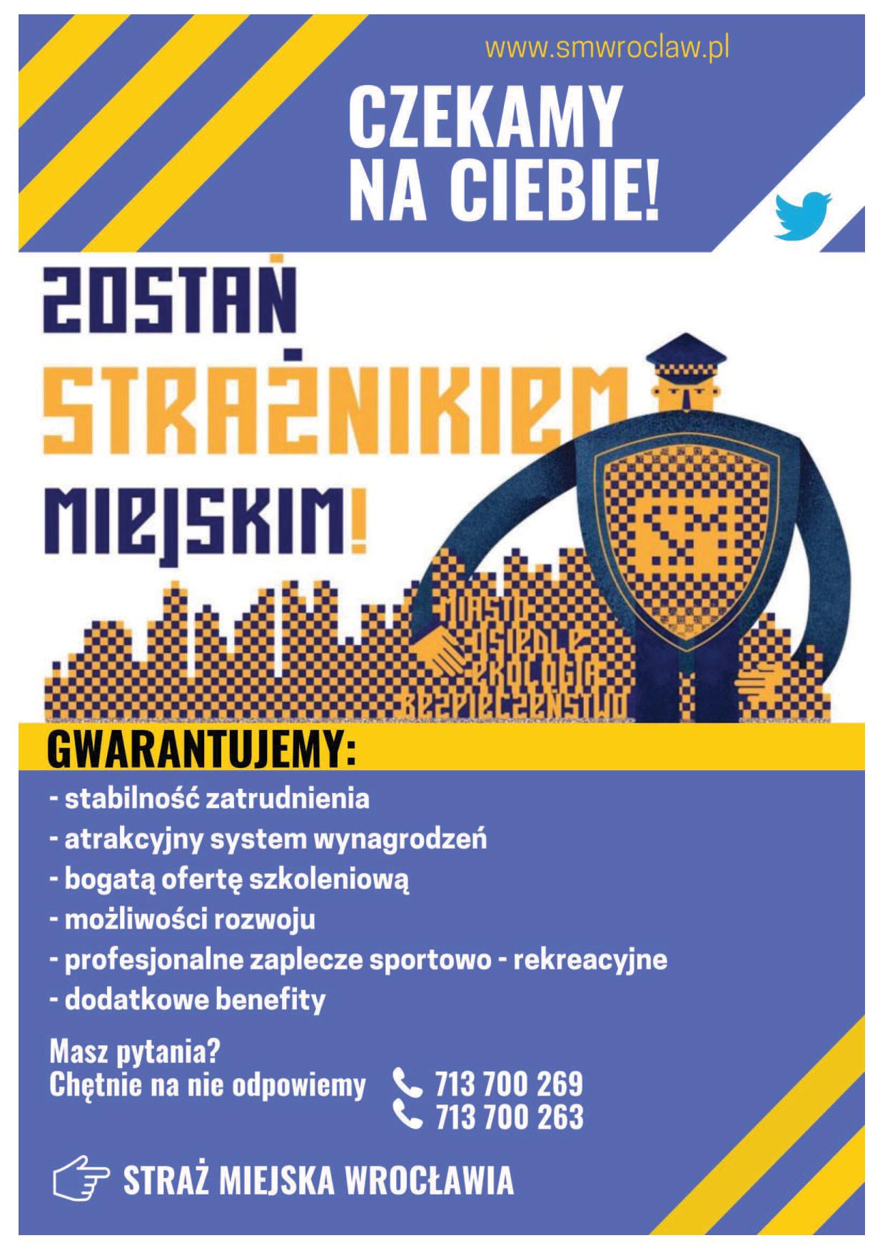 Straż Miejska Wrocławia w chwili obecnej prowadzi nabór na stanowisko strażnika miejskiego – aplikanta (45 etatów). Już od 28 lat jako solidny pracodawca inwestujemy w indywidualny rozwój każdego pracownika i zapewniamy stabilne miejsca pracy. Kierujemy do Państwa naszą ofertę, ponieważ jesteśmy przekonani, że możemy być atrakcyjnym pracodawcą również dla Państwa mieszkańców.