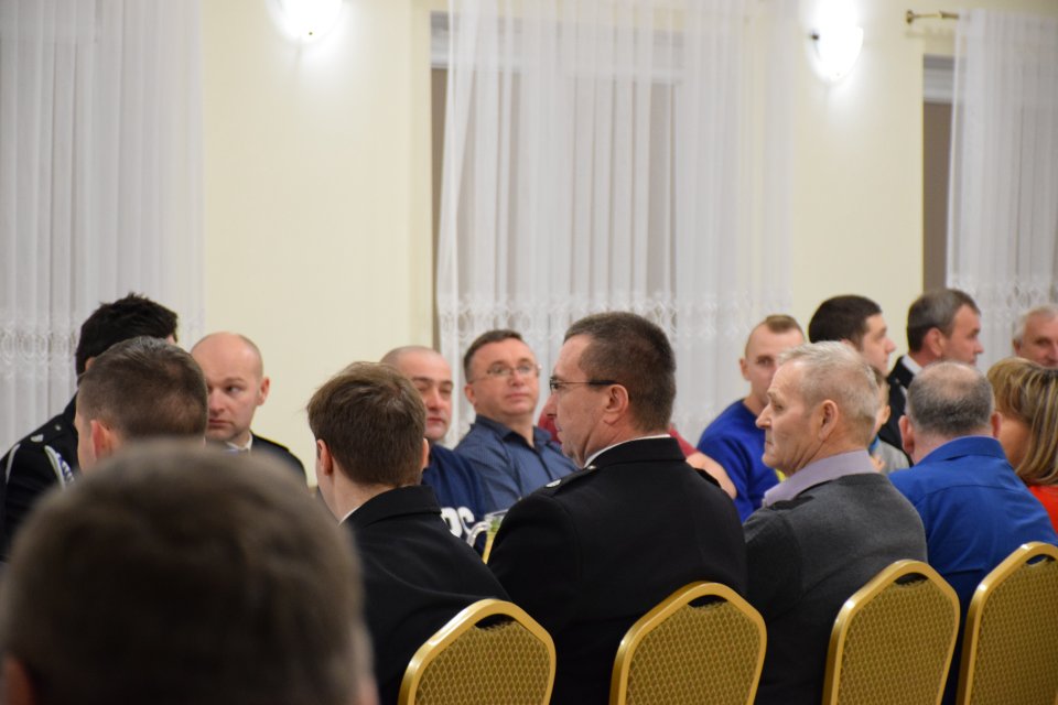 Następnie głos zabrali Pan Marek Kamiński – Z-ca Komendanta Wojewódzkiego PSP we Wrocławiu, wręczając Prezesom oraz Pani Wójt listy gratulacyjne oraz Pan Łukasz Michalski, w imieniu Pana Łukasza Kasztelowicza – Prezesa Wojewódzkiego Funduszu Ochrony Środowiska we Wrocławiu. Obaj Panowie serdecznie pogratulowali sukcesu na wysoką skalę, bo rzadkością jest otrzymanie dotacji jednocześnie na dwa wozy strażackie. Ww. życzyli tylko takich akcji strażackich, które zawsze będą się kończyć sukcesem oraz częstszych wyjazdów na zawody niż na akcje ratownicze. Następnie zgromadzeni goście, zostali zaproszeni do wspólnego zdjęcia, po czym podano ciepłe posiłki wraz z zakąskami, które przyrządzone zostały na nowo zakupionym sprzęcie będącym wyposażeniem CIL-u. Kolejnym punktem wieczoru był słodki poczęstunek w postaci tortu z logo OSP, który symbolicznie przecięli Prezesi wraz z Panią Wójt. W miłej, rodzinnej atmosferze, przebiegała reszta wieczoru.
