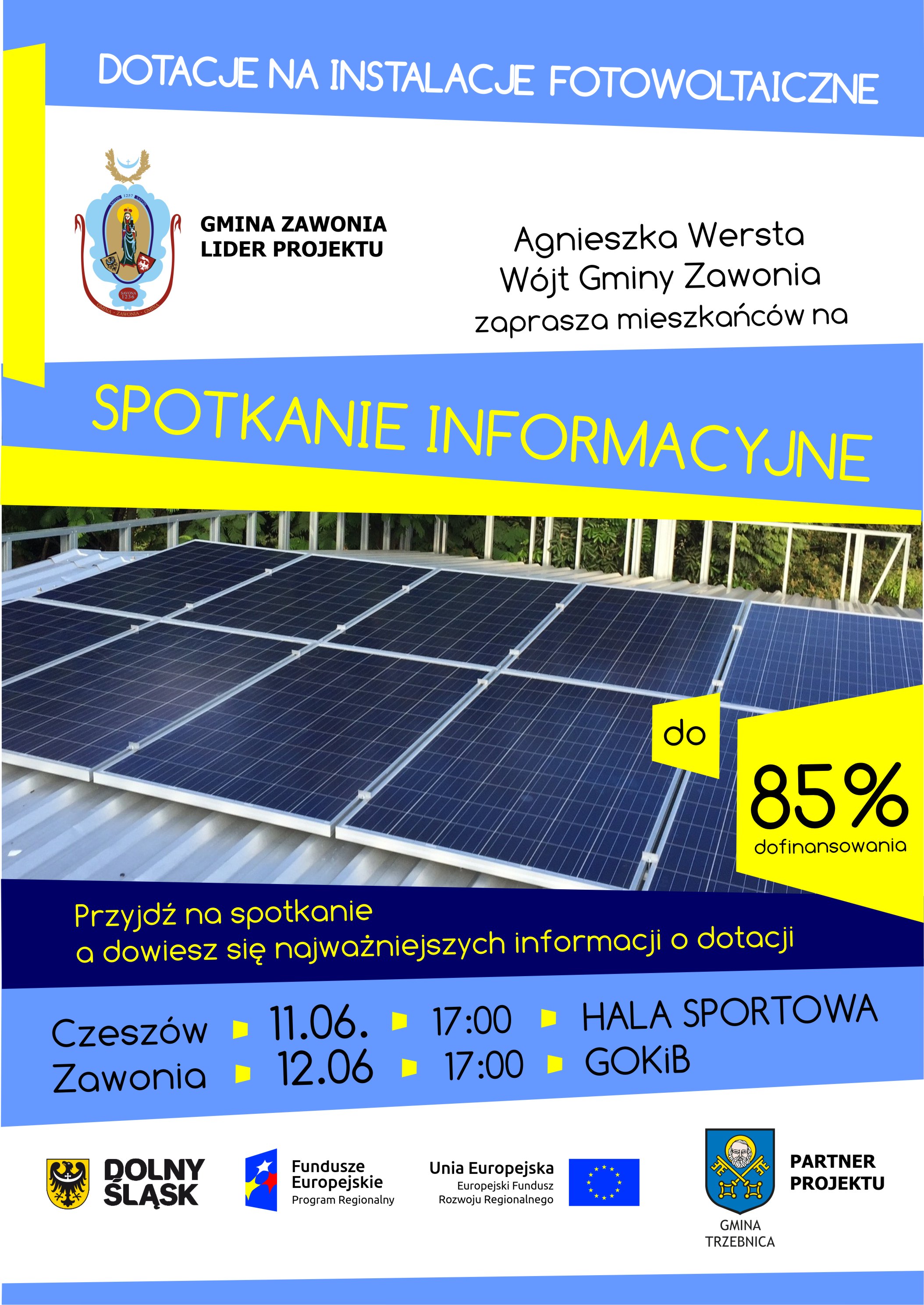 Wójt Gminy Zawonia w związku z pozyskanym dofinansowaniem dla mieszkańców gminy środków finansowych na montaż instalacji fotowoltaicznych na budynkach jednorodzinnych, zaprasza na spotkanie podczas, którego zainteresowani otrzymają wszelkie wyjaśnienia techniczne i finansowe projektu pn. " Instalacje OZE w Gminie Zawonia oraz w Gminie Trzebnica".