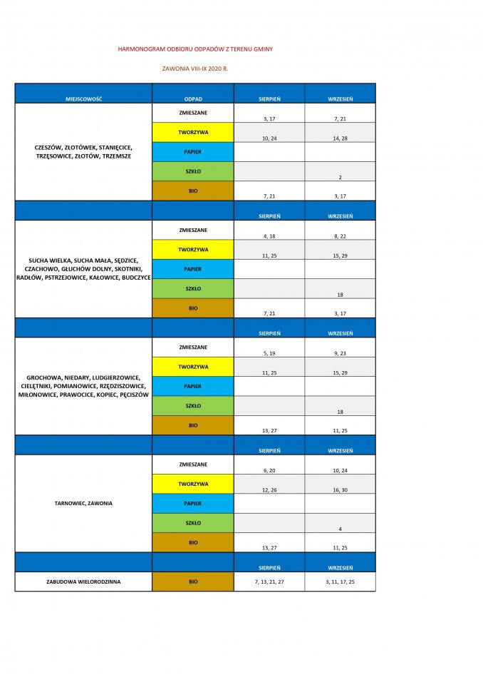 Harmonogram wywozu odpadów z terenu Gminy VIII - IX. 2020 r. - wersja pdf.