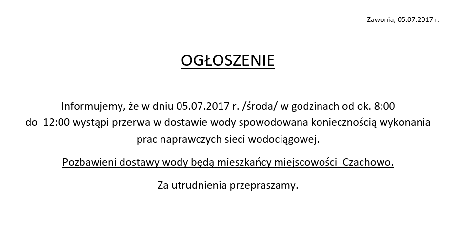 Przerwa w dostawie wody spowodowana koniecznością wykonania prac naprawczych sieci wodociągowej.