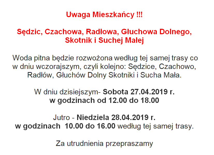 Informacja dotycząca dostaw wody pitnej w dniach 27-28.04.2019 r
