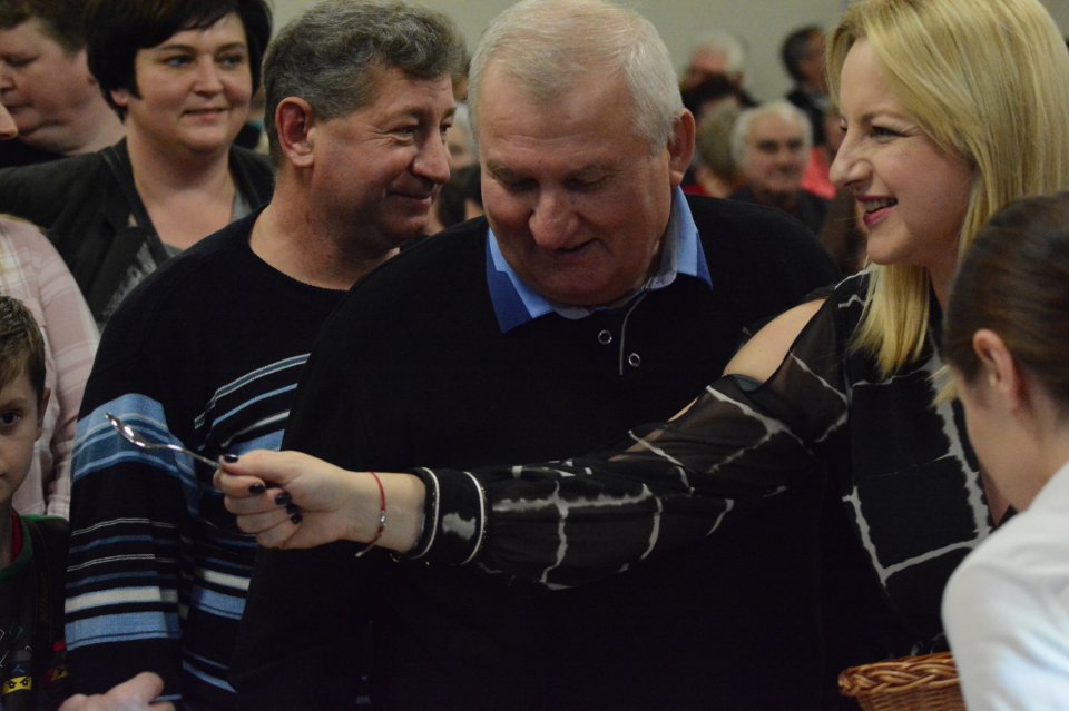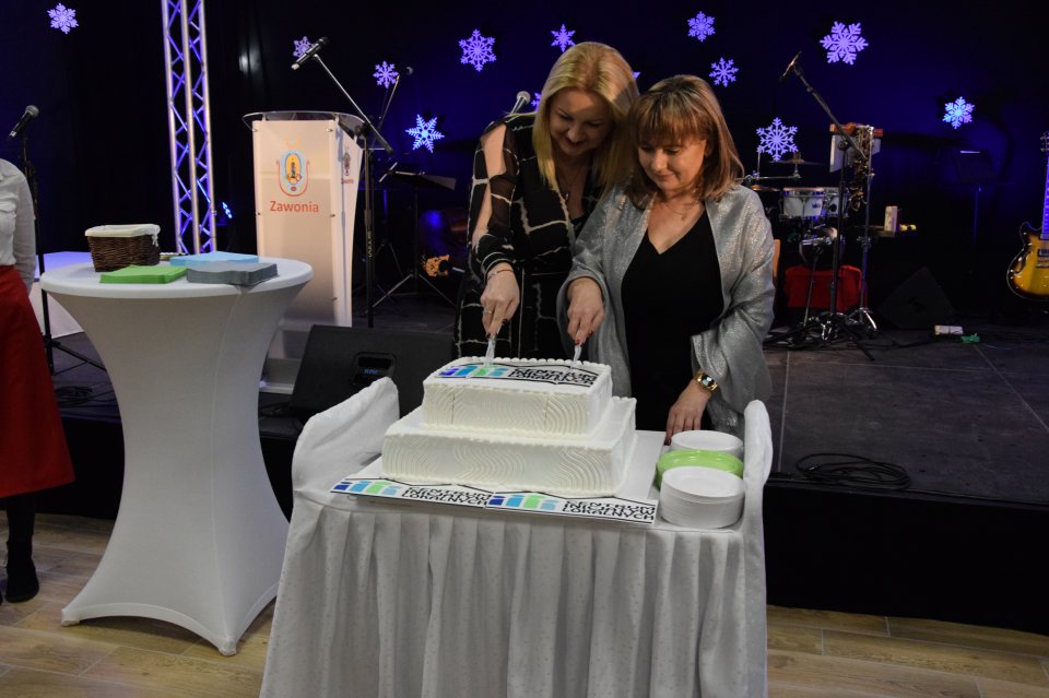 Pani Wójt zaprosiła wszystkich wyróżnionych, by razem z nią dokonali symbolicznego przecięcia wstęgi. Po przecięciu wstęgi na salę wjechał tort z logo Centrum, który został pokrojony przez panią Wójt oraz panią Sołtys.