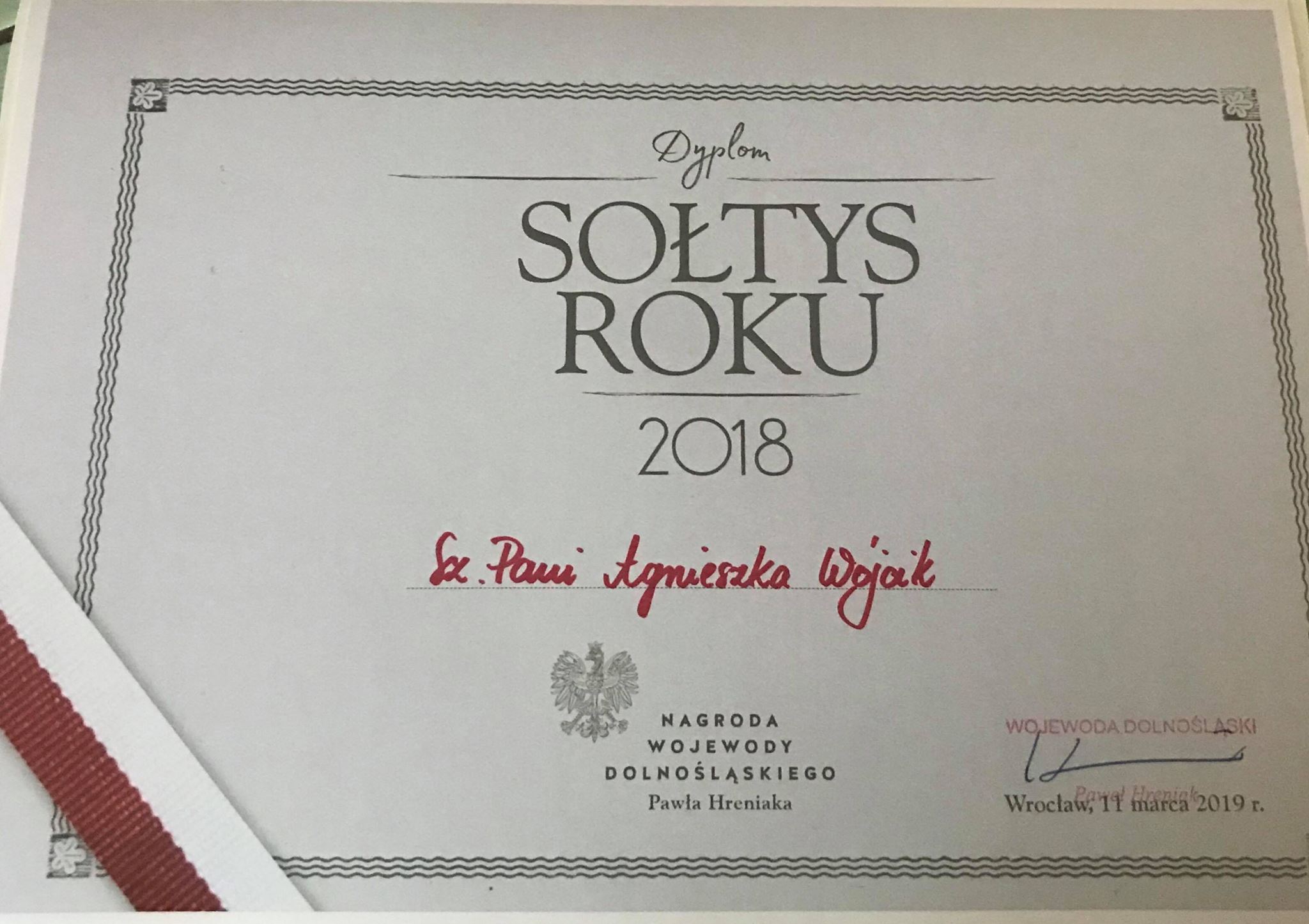 W dniu 11. marca w sali koncertowej Akademii Muzycznej im. Karola Lipińskiego odbyła się gala konkursu Wojewody Dolnośląskiego Pawła Hreniaka na Sołtysa Roku 2018. Do konkursu z terenu naszej gminy zgłoszono w tym roku Panią Sołtys wsi Czeszów Beatę Borowiak oraz Panią Sołtys sołectwa Grochowo Agnieszkę Wójcik.