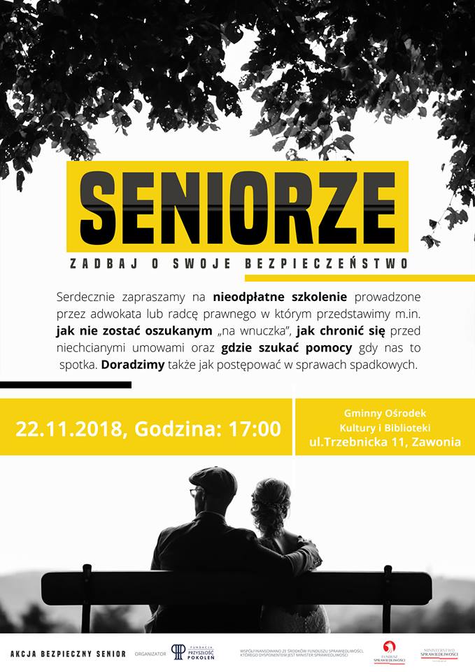W ramach czwartkowych spotkań w Klubie Seniora w dniu 22.11. o 17:00 odbędzie się w Sali Klubowej spotkanie dla naszych seniorów. Program Bezpieczny Senior Ministerstwa Sprawiedliwości i Fundacji Przyszłość Pokoleń ma służyć bezpieczeństwu. Bowiem mimo trwających kampanii społecznych seniorzy wciąż padają ofiarami oszustw oraz nieetycznych i wprowadzających w błąd praktyk przedsiębiorstw. Organizatorzy są przekonani, że tylko odpowiednie uwrażliwienie naszych rodziców, babć, dziadków i dalszych bliskich na kwestie ich bezpieczeństwa, pozwoli uchronić ich przed wieloma niebezpieczeństwami nań czyhającymi.