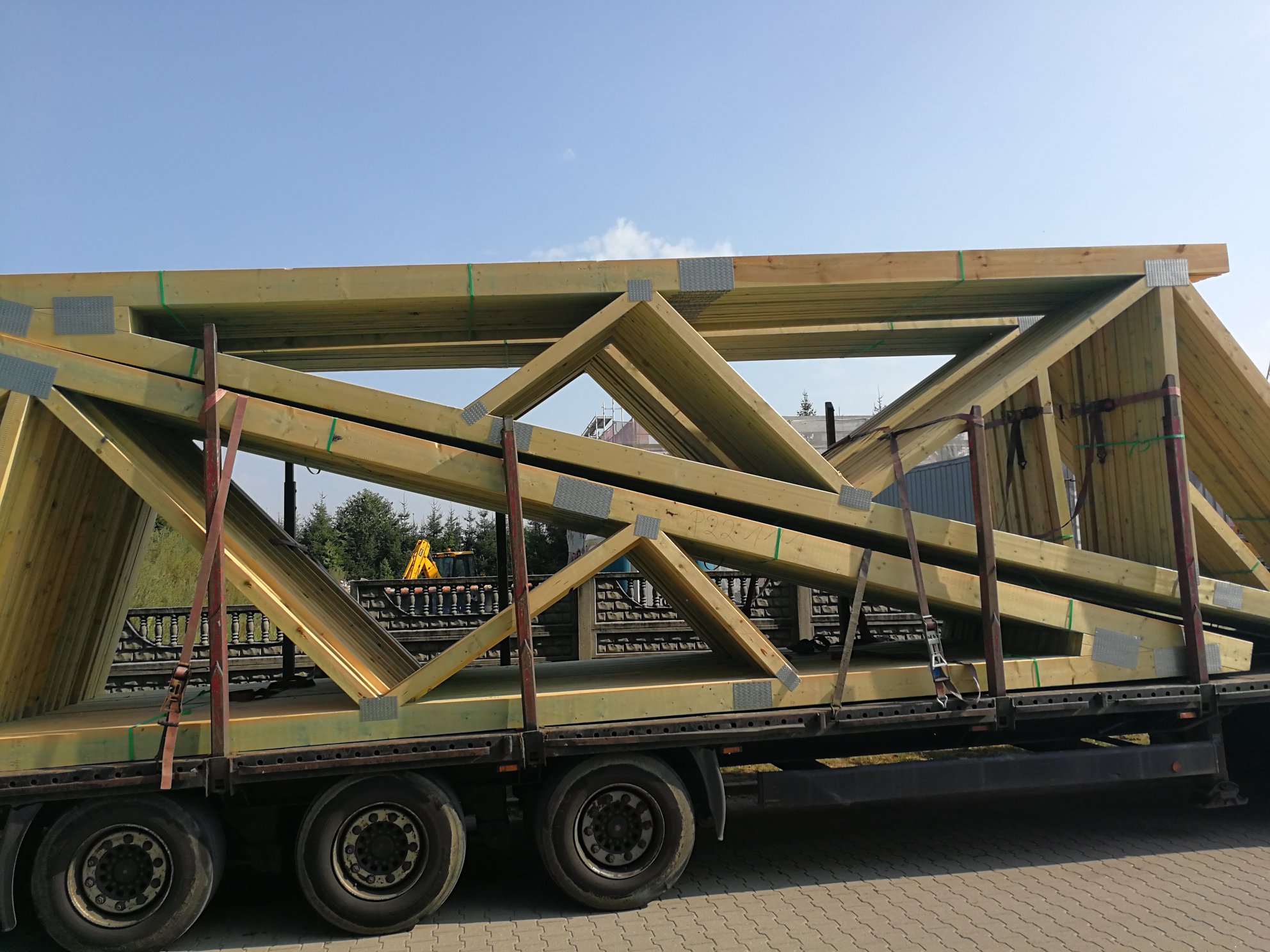 Na piętrze budynku po wylaniu ścian zewnętrznych wybudowane są już ściany działowe z pustaków oraz w dniu wczorajszym przywieziono i rozpoczęto montaż konstrukcji dachu.