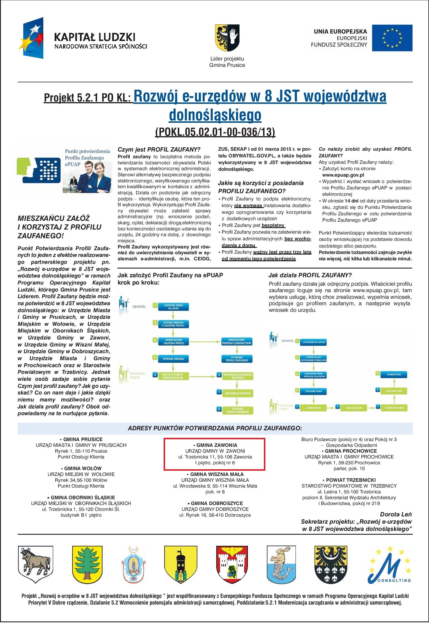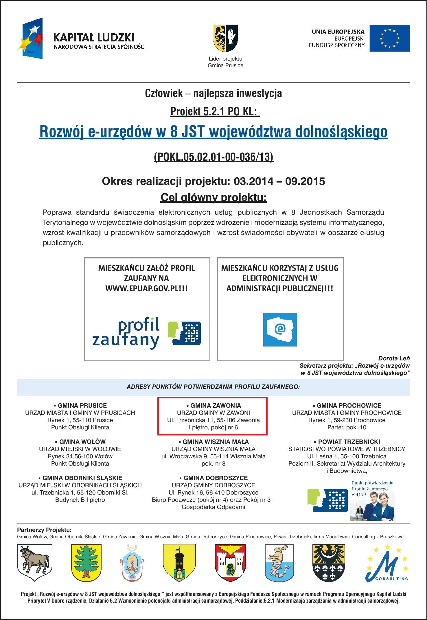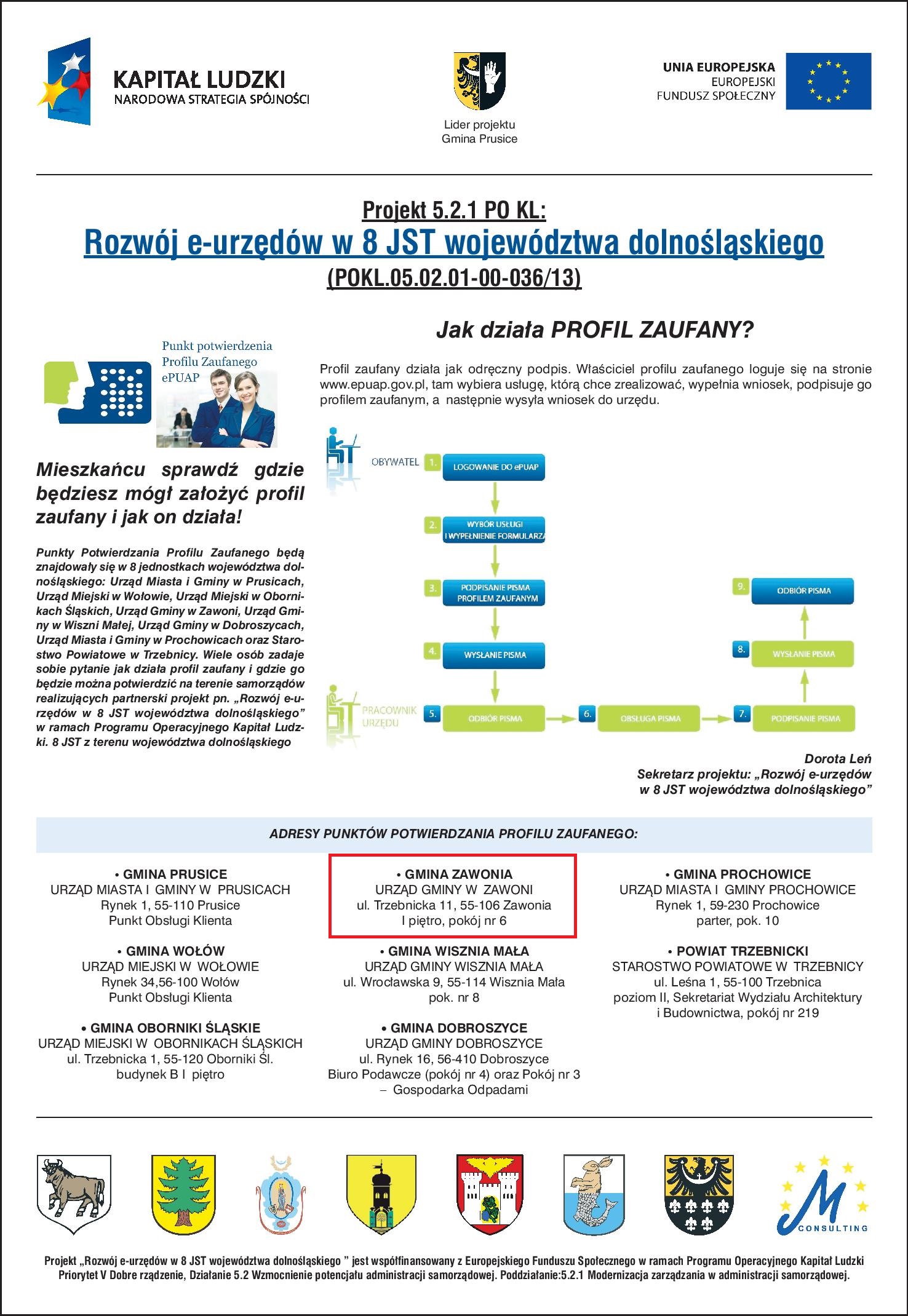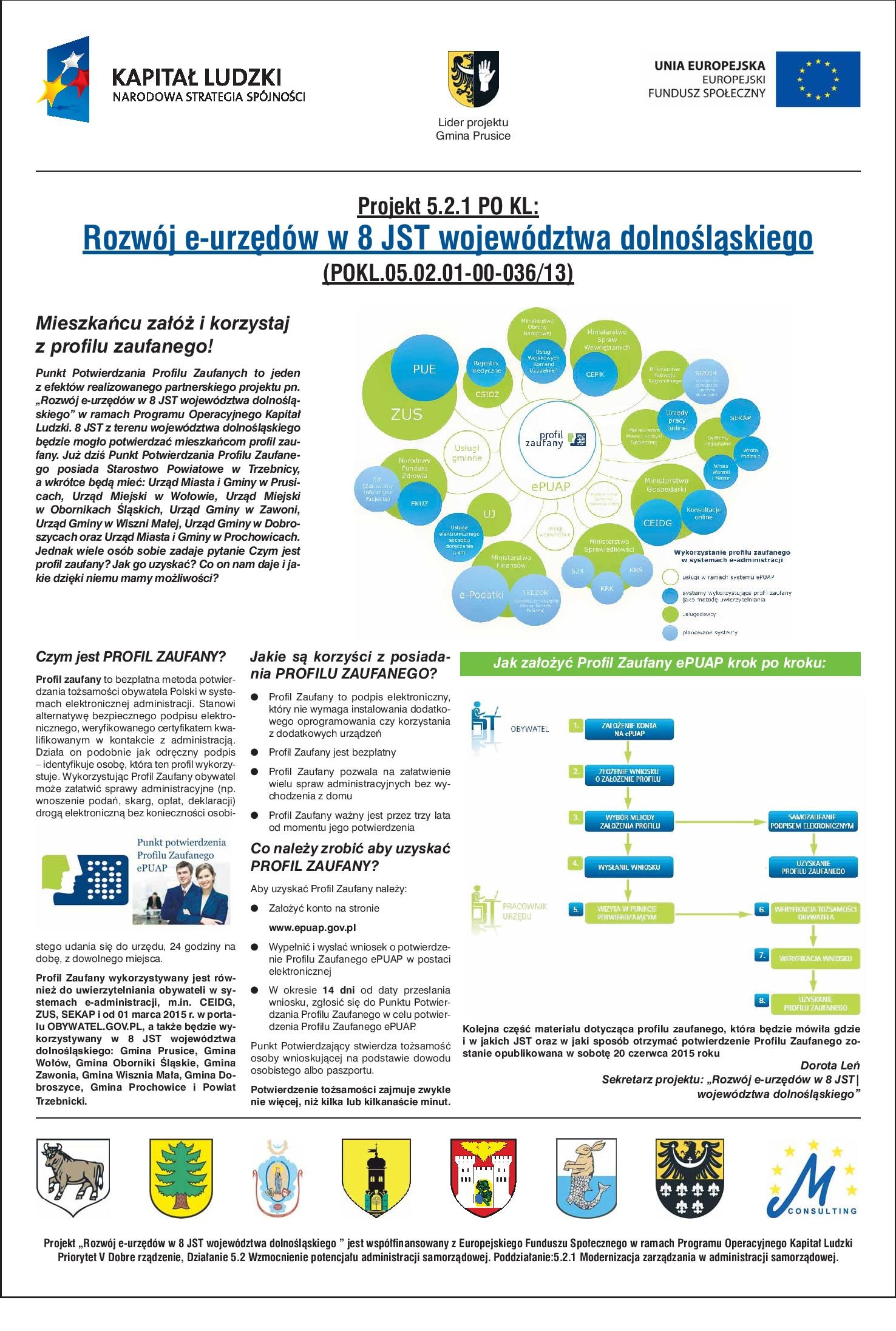 Punkt Potwierdzania Profilu Zaufanych to jeden z efektów realizowanego partnerskiego projektu pn. „Rozwój e-urzędów w 8 JST województwa dolnośląskiego” w ramach Programu Operacyjnego Kapitał Ludzki. 8 JST z terenu województwa dolnośląskiego będzie mogło potwierdzać mieszkańcom profil zaufany.