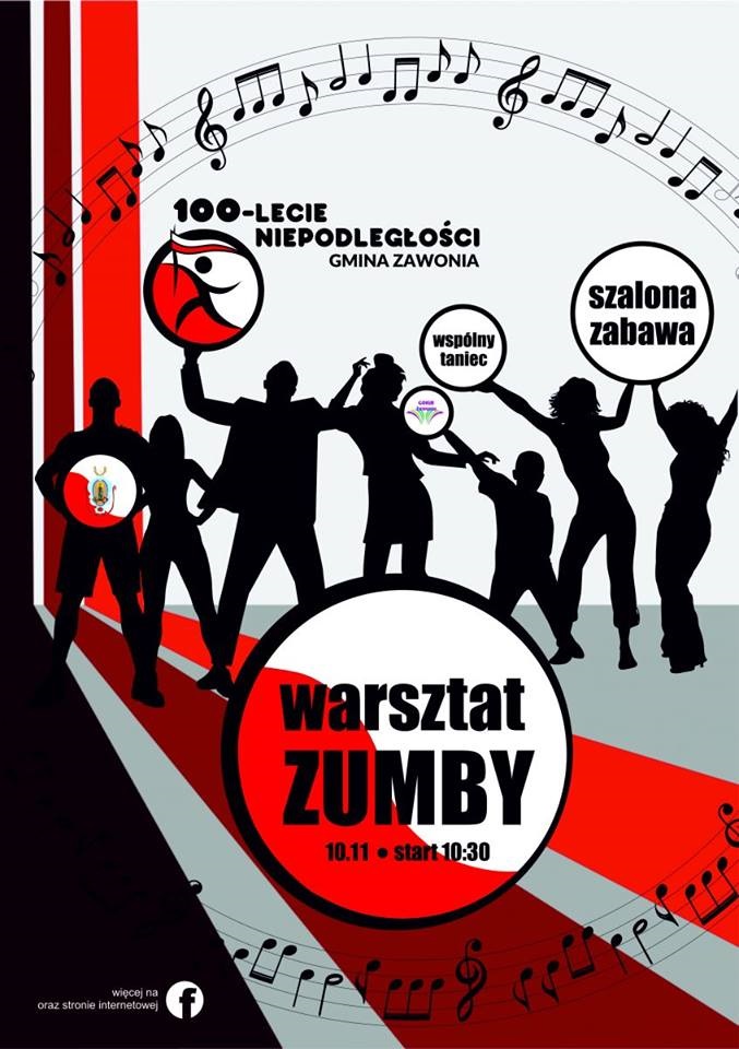 Dlatego też, 10 listopada zapraszamy do ćwiczeń w rytm muzyki czyli na Warsztat Zumby. Start o godzinie 10:30 w sali widowiskowej GOKiB Zawonia.