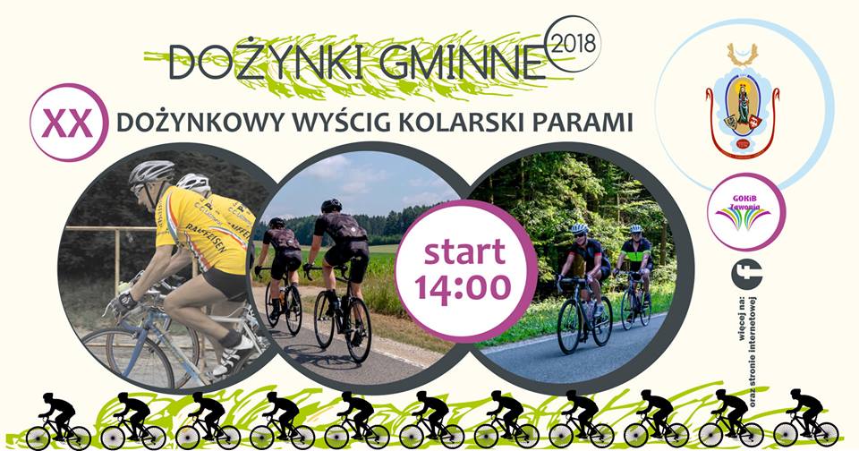 Jak co roku, Dożynki Gminne rozpoczniemy Dożynkowym Wyścigiem Kolarskim Parami, w tym roku będzie to jubileuszowa bo XX edycja wyścigu. Trasa będzie przebiegała jak w zeszłym roku, dla każdego uczestnika przewidziane upominki, a dla wygranych cenne nagrody rzeczowe oraz puchary.