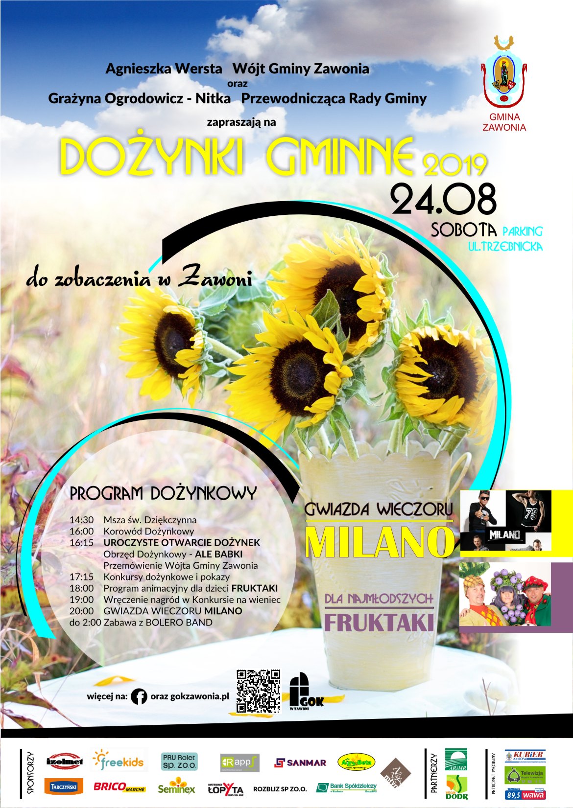 Na wspólną rodzinną zabawę zapraszają najmłodszych FRUKTAKI. Wieczorem na scenie wysłuchamy porywającego koncertu zespołu MILANO a do późnych godzin nocnych bawić nas będzie BOLERO BAND.